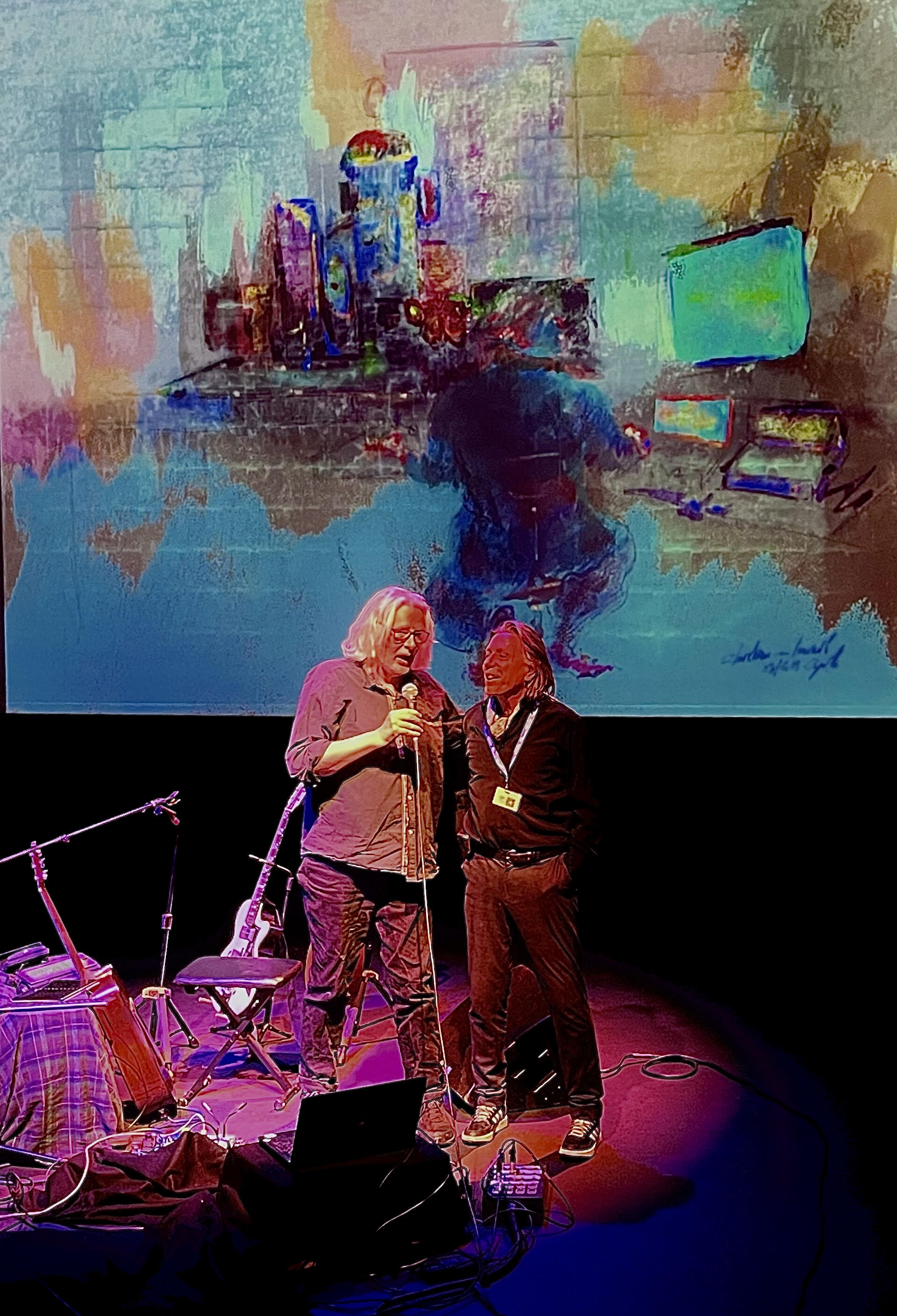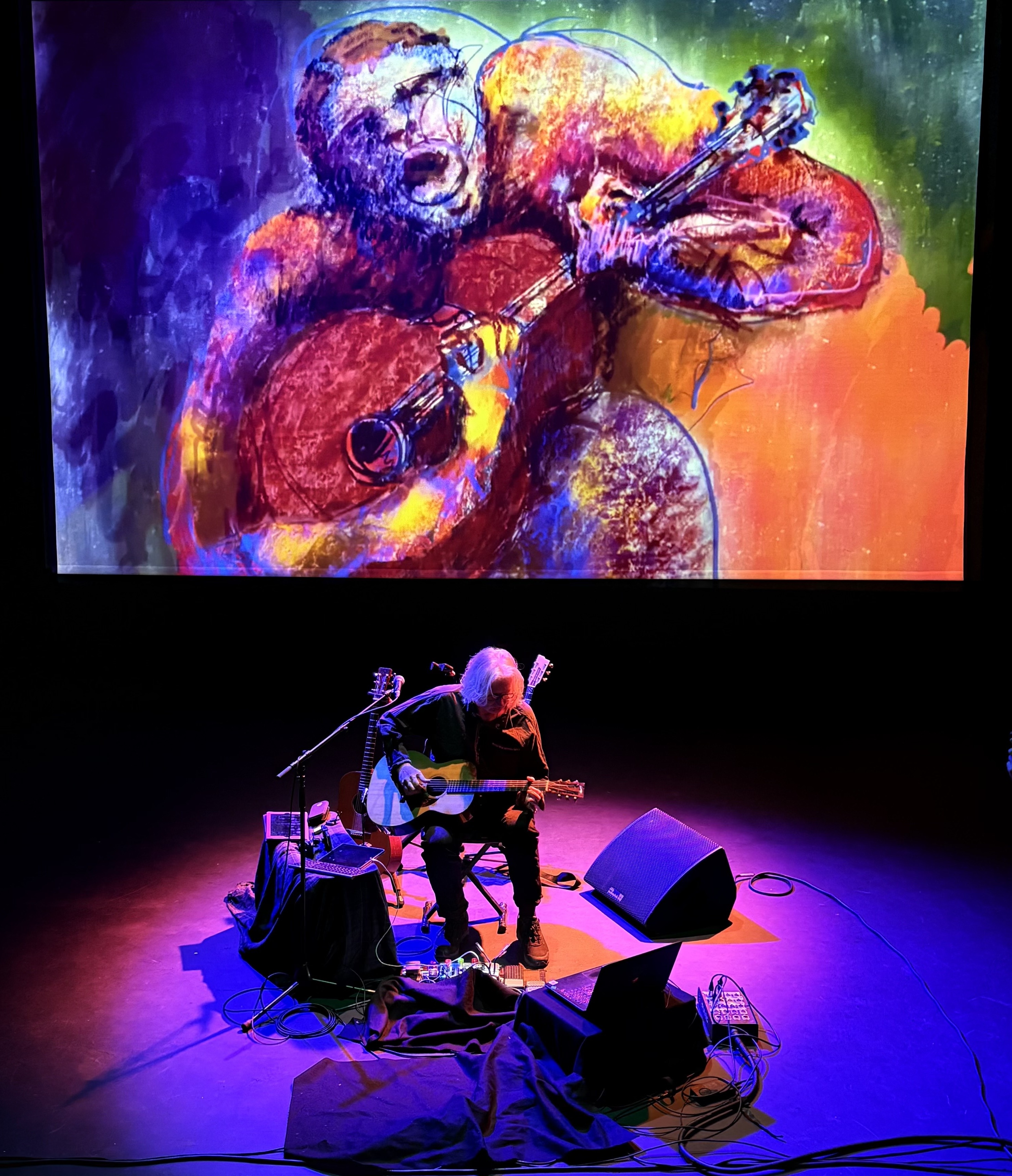 In "Painting with Sound" or “Vagabondage musical” layers of colour in Cyrille’s digital art created on iPad or tablet are melded with layers of music as David builds up a rich tapestry of sound on guitar.