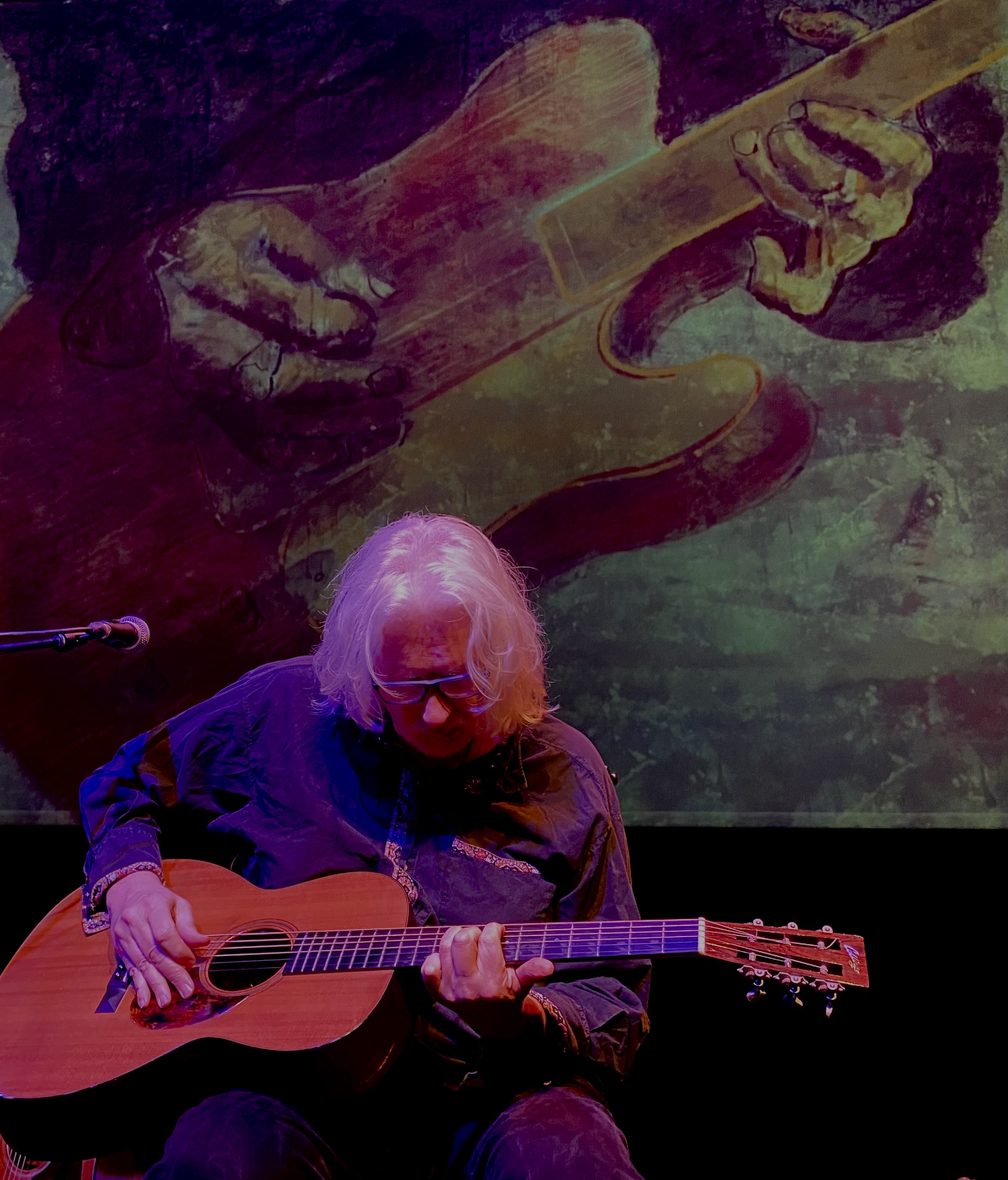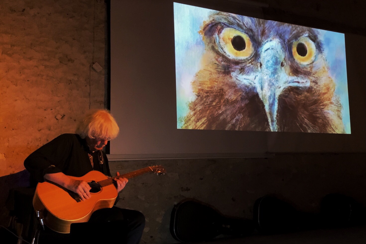 In "Painting with Sound" or “Vagabondage musical” layers of colour in Cyrille’s digital art created on iPad or tablet are melded with layers of music as David builds up a rich tapestry of sound on guitar.